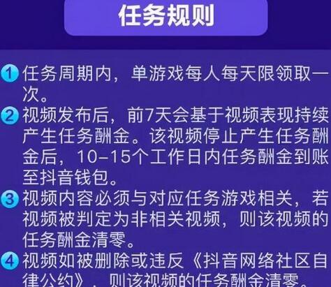 在任务周期内,单游戏每人领取一次,视频发布后前7天会根据视频表现持续产生任务酬金,10~15个工作日内酬金会到账至抖音钱包。