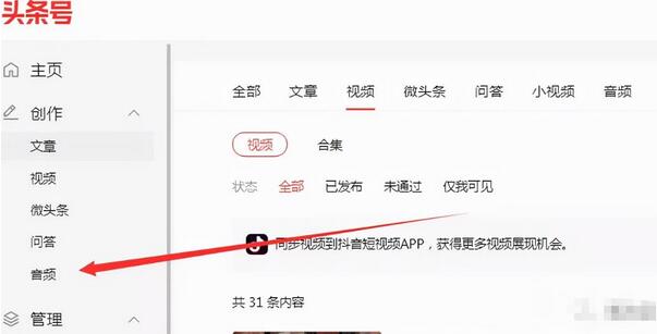 登录头条号后台,点击“创作-音频”发表音频