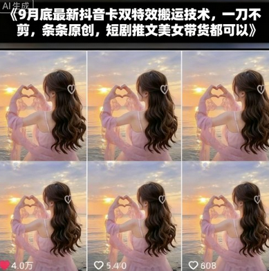 免责声明:站内部分内容由互联网用户自发贡献,该文观点仅代表作者本人。本站仅提供信息存储空间服务,不拥有所有权,不承担相关法律责任。展示内容仅作为学习交流使用,其版权归出版公司或原作者所有,本站不对所涉及的版权问题负责。如原作者认为侵权,请联系我们,我们会立即删除文章!蜗牛学社 » 9月底最新抖音卡双特效搬运技术,一刀不剪,条条原创,短剧推文美女带货都可以