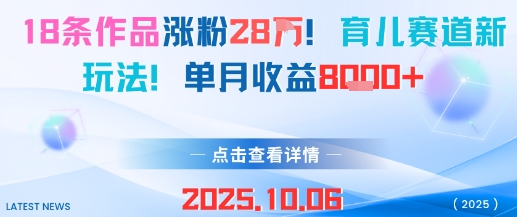 18条作品涨粉28W,育儿赛道新玩法,单月收益8k