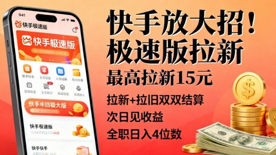 快手放大招!极速版拉新,最高拉新15米,拉新+拉旧双双结算,次日见收益,全职日入4位数