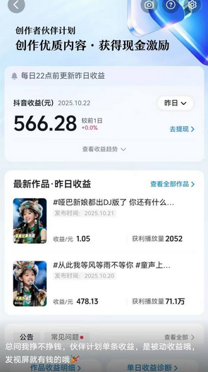 最近非常火的一个项目,起号做账号,多种变形方式,可以分成计划-广告收益-音乐推广-收徒-商单等,下面是抖音创造者伙伴计划收益图: