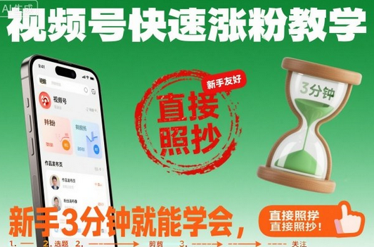 免责声明:站内部分内容由互联网用户自发贡献,该文观点仅代表作者本人。本站仅提供信息存储空间服务,不拥有所有权,不承担相关法律责任。展示内容仅作为学习交流使用,其版权归出版公司或原作者所有,本站不对所涉及的版权问题负责。如原作者认为侵权,请联系我们,我们会立即删除文章!蜗牛学社 » 视频号快速涨粉教学,新手3分钟就能学会,直接照抄!