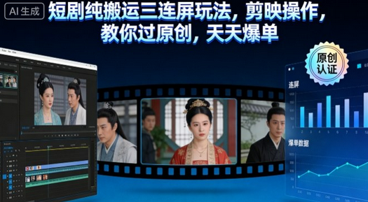 短剧纯搬运三连屏玩法,剪映操作,教你过原创,天天爆单