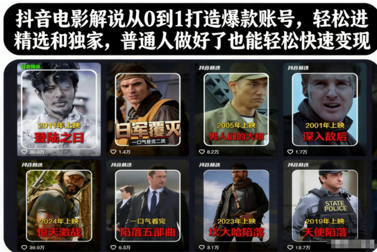 免责声明:站内部分内容由互联网用户自发贡献,该文观点仅代表作者本人。本站仅提供信息存储空间服务,不拥有所有权,不承担相关法律责任。展示内容仅作为学习交流使用,其版权归出版公司或原作者所有,本站不对所涉及的版权问题负责。如原作者认为侵权,请联系我们,我们会立即删除文章!蜗牛学社 » 抖音电影解说从0到1打造爆款账号,轻松进精选和独家,普通人做好了也能轻松快速变现
