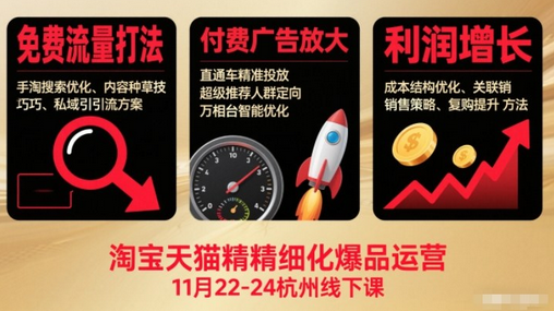 淘宝天猫精细化爆品运营11月22-24杭州线下课,免费流量打法+付费广告放大+利润增长(音频+文档)