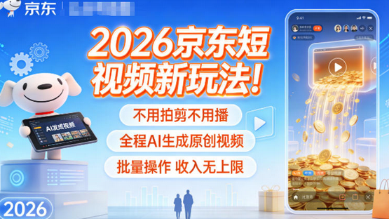 免责声明:站内部分内容由互联网用户自发贡献,该文观点仅代表作者本人。本站仅提供信息存储空间服务,不拥有所有权,不承担相关法律责任。展示内容仅作为学习交流使用,其版权归出版公司或原作者所有,本站不对所涉及的版权问题负责。如原作者认为侵权,请联系我们,我们会立即删除文章!蜗牛学社 » 2026京东短视频新玩法!不用拍剪不用播,全程AI生成原创视频,批量操作收入无上限