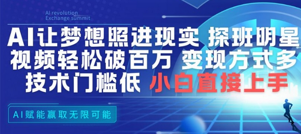 AI让梦想照进现实,探班明星视频,轻松破百万播放,变现方式多,技术门槛低,小白直接上手 项目介绍: AI又一个蓝海新玩法,人物探班明星,视频流量猛,起号快,变现能力强,0基础 下载地址: 本文隐藏内容 登陆 后才可以浏览
