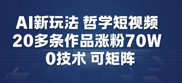 AI新玩法哲学短视频制作教学,20多条作品涨粉70W,0成本赛道,可矩阵