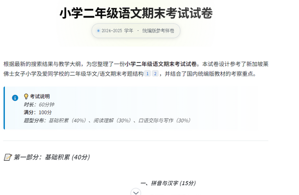 比如我在搜,小学二年级语文期末考试,它能直接给你出一个试卷: