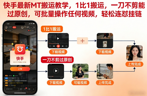 快手最新MT搬运教学,1比1搬运,一刀不剪能过原创,可批量操作任何视频,轻松连怼挂链