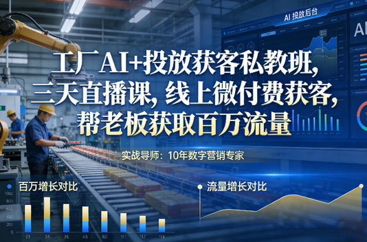 当下,工厂获客早已告别“靠人脉、靠线下”的传统模式,AI+微付费投放才是低成本、高效率、可放大的获客新路径!这款工厂AI+投放获客私教班,用三天时间,私教式指导、落地式教学,帮你吃透AI+微付费获客技巧,用低成本获取百万精准流量,打通工厂获客新渠道,让订单主动找上门,助力工厂扩大规模、稳步增长!