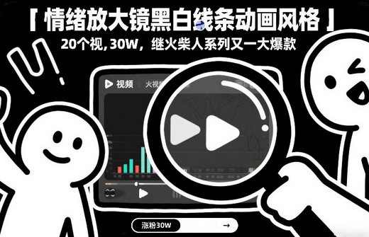 情绪放大镜黑白线条动画风格,20个视频,涨粉30W,继火柴人系列又一大爆款