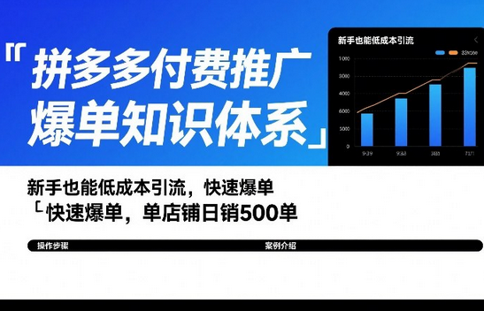 这款拼多多付费推广爆单知识体系课程,专为新手量身打造,系统覆盖全渠道、全技巧,聚焦“低成本引流、快速爆单”,手把手带练、全流程护航,让你不用懂复杂理论、不用花大额预算,就能轻松玩转拼多多付费推广,从新手快速成长为能独立投放、能快速爆单的运营,用最少的投入撬动最大的收益,实现店铺起量、业绩翻倍,在激烈的拼多多赛道中脱颖而出、稳步盈利!