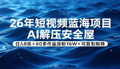 26年短视频蓝海项目,AI解压安全屋,日入8张+60多作品涨粉16W+可复制矩阵