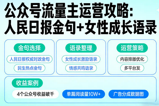 零粉丝也能做的公众号变现项目来啦!聚焦人民日报金句+女性成长语录赛道,无需创作功底、不用粉丝基础,新手也能快速上手,熟练后可多号复制放大收益。核心是整合人民日报自带权威感的正能量金句,搭配治愈、清醒的女性成长语录,打造简短好读、易转发的爆款短文,开通流量主后靠文章阅读量、广告点击量实现变现。该赛道受众广,学生、职场女性、宝妈等群体均有高关注度,女性用户更爱点赞收藏转发,轻松提升文章曝光。操作流程简单易复制,一分钟就能完成一篇爆款文创作,前期做好基础养号,把控发布细节,保持内容垂直度,三个月后收益逐步提升,是低门槛、易操作的轻资产变现好项目。