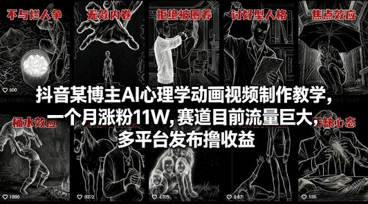免责声明:站内部分内容由互联网用户自发贡献,该文观点仅代表作者本人。本站仅提供信息存储空间服务,不拥有所有权,不承担相关法律责任。展示内容仅作为学习交流使用,其版权归出版公司或原作者所有,本站不对所涉及的版权问题负责。如原作者认为侵权,请联系我们,我们会立即删除文章!蜗牛学社 » 抖音某博主AI心理学动画视频制作教学,一个月涨粉11W,赛道目前流量巨大,多平台发布撸收益