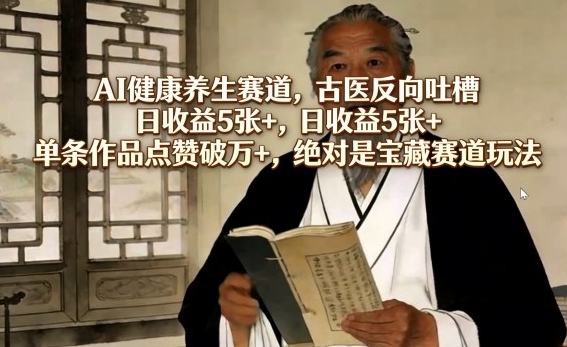 AI健康养生赛道,古医反向吐槽,日收益5张+,单条作品点赞破万+,绝对是宝藏赛道玩法