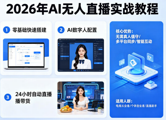 免责声明:站内部分内容由互联网用户自发贡献,该文观点仅代表作者本人。本站仅提供信息存储空间服务,不拥有所有权,不承担相关法律责任。展示内容仅作为学习交流使用,其版权归出版公司或原作者所有,本站不对所涉及的版权问题负责。如原作者认为侵权,请联系我们,我们会立即删除文章!蜗牛学社 » 2026年AI无人直播实战教程,零基础也能快速搭建AI数字人无人直播间,实现24小时自动直播带货