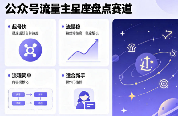 公众号星座盘点赛道,是新手也能快速起号、稳定变现的低门槛流量主项目。该赛道受众以年轻群体为主,对星座性格、运势、情感话题关注度极高,自带流量基础,起号快、入池稳,即便没有大爆款也能保持稳定阅读。