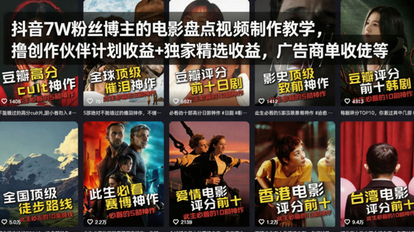 抖音7W粉丝博主的电影盘点视频制作教学,撸创作伙伴计划收益+独家精选收益,广告商单收徒等