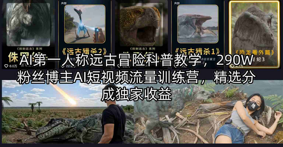 AI第一人称远古冒险科普教学,290W粉丝博主AI短视频流量训练营,精选分成独家收益