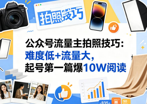 本项目聚焦公众号流量主小众赛道——普通人拍照技巧,主打零门槛、高流量、易实操,适合新手快速起号变现。赛道优势显著,起号难度低、流量稳定,内容无需复杂专业知识,均为普通人看完可直接上手的实用拍照技巧,易出爆款,适配公众号流量主变现逻辑。