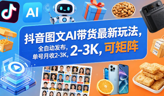 免责声明:站内部分内容由互联网用户自发贡献,该文观点仅代表作者本人。本站仅提供信息存储空间服务,不拥有所有权,不承担相关法律责任。展示内容仅作为学习交流使用,其版权归出版公司或原作者所有,本站不对所涉及的版权问题负责。如原作者认为侵权,请联系我们,我们会立即删除文章!蜗牛学社 » 抖音图文AI带货最新玩法,全自动发布,单号月收2-3K,可矩阵