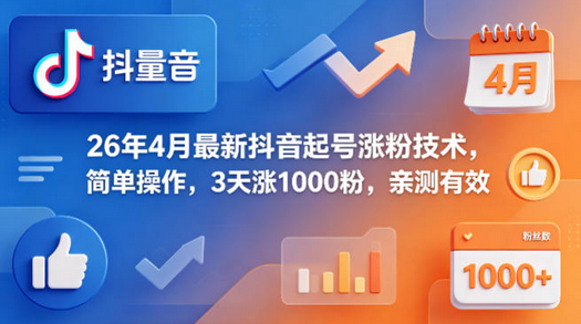2026年4月抖音生态全面升级,涨粉窗口期稍纵即逝!不用再羡慕别人快速起号、不用再自己盲目试错,这门课把4月最新、最有效的涨粉方法全部教给你,简单操作、零成本、亲测有效,3天涨满1000粉,快速打通抖音变现第一步,抓住最新流量红利,轻松做起来自己的抖音账号!