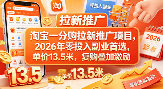 淘宝一分购拉新推广项目,2026年零投入副业首选,单价13.5米,复购叠加激励!